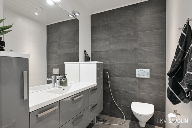 - Erillisessä wc:ssä on iso peili ja runsaasti säilytystilaa.