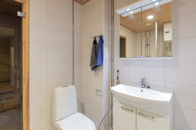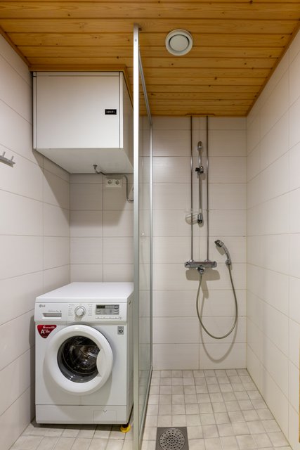 - WC-istuin, suihku, pesukoneliitäntä, peilikaappi, pesuallas, allaskaappi, ja bidee-suihku