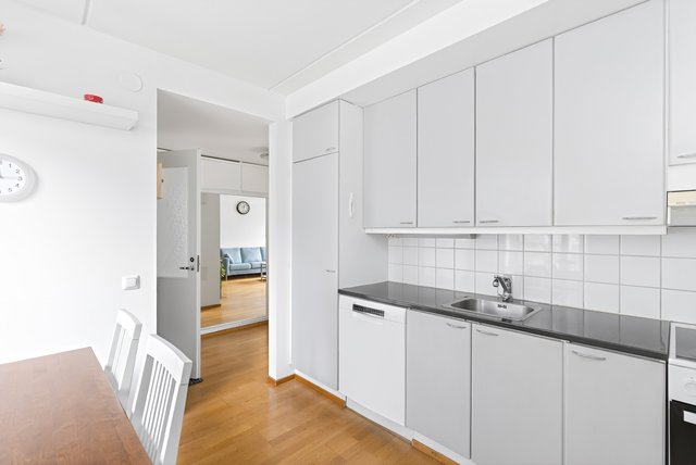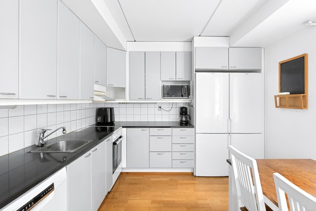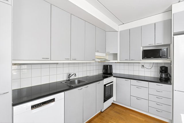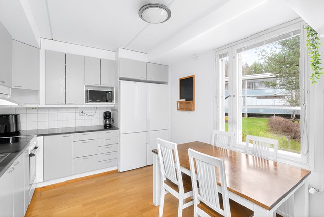 - Keittiössä runsaasti kaappi- ja työtilaa ja sinne mahtuu hyvin ruokailuryhmä. Työtasot uusittu 2009. Varusteet: 2 x Siemens noFrost jääkaappi/pakastin (2009), UPO keraaminen liesi/kiertoilmauuni (2009), Bosch astianpesukone (2013), liesituuletin, paikka mikroaaltouunille, kiinteät valaisimet. Työtaso: laminaatti Välitila: kaakeli Lattia: tammiparketti Seinät: maalattu