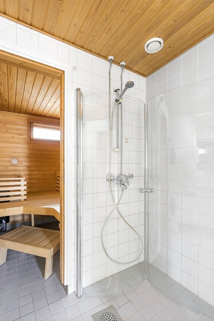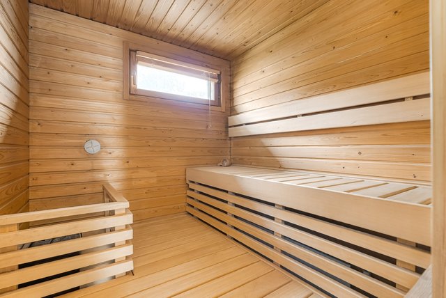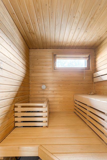 - Oma sauna lämpiää sähkökiukaalla ja siellä on pieni ikkuna, jossa puiset kaihtimet. Tyylikkäät mittojen mukaan tehdyt lauteet, ledivalot selkänojassa. Seinät: puupaneeli Lattia: laatta