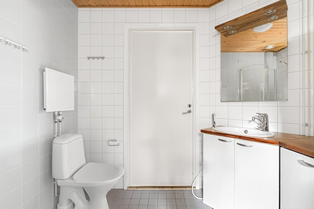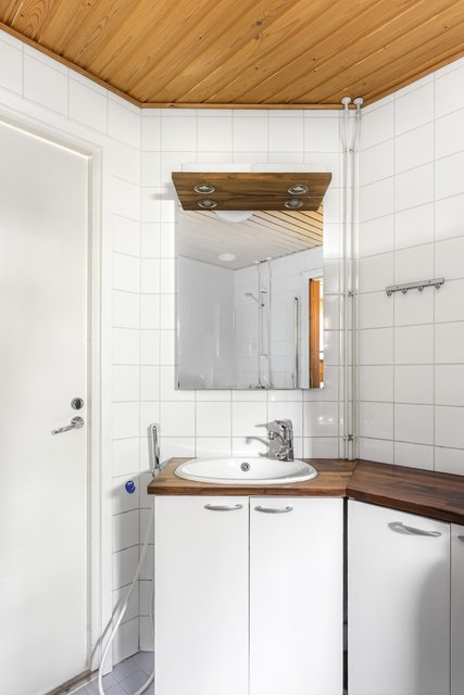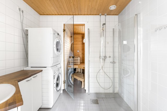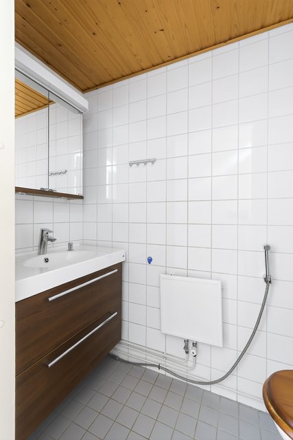 - Kylpyhuoneessa suihku, kääntyvät suihkuseinät, wc-istuin, bidee-suihku, peili, puiset tasot, upotettu Temal allas ja allaskaappi, 2 x integroidut pyykkikorit kaapissa, pesukoneliitäntä ja tilaa pesutornille. Seinät: kaakeli Lattia: laatta (lattialämmitys)