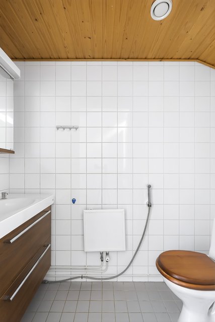 - Alakerrassa erillinen wc, jossa wc-istuin, bidee-suihku, Temal allas, allaslaatikosto, peilikaappi. Seinät: kaakeli Lattia: laatta Katto: paneloitu
