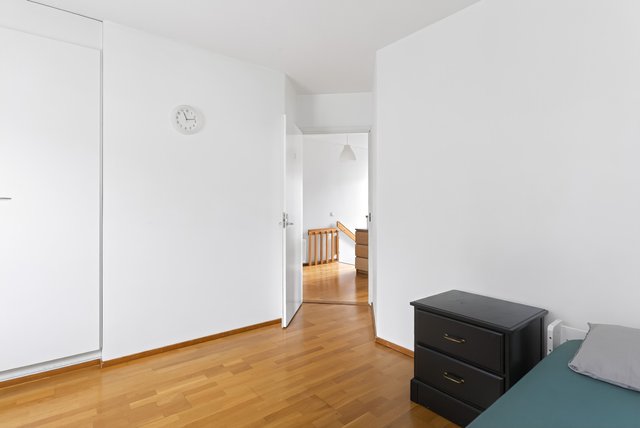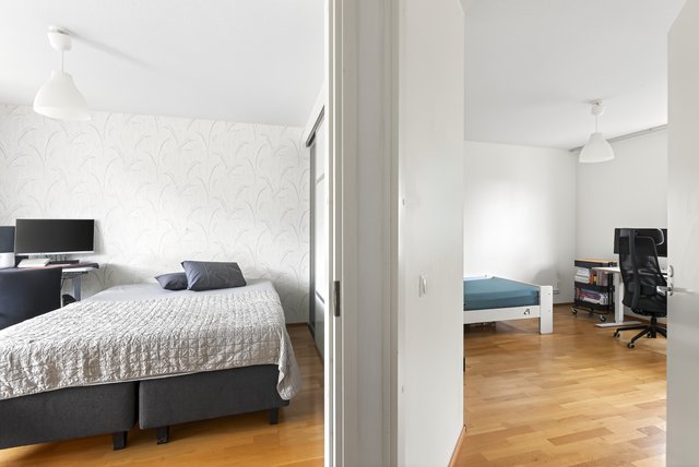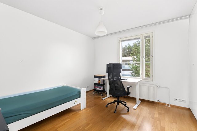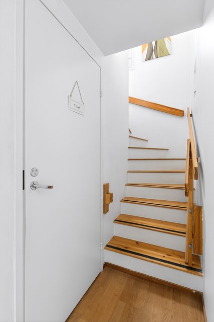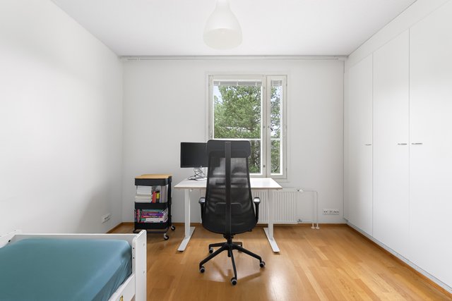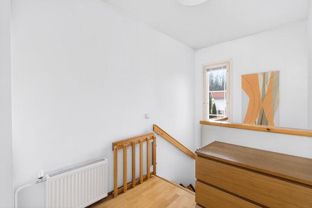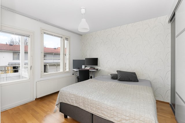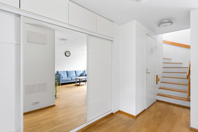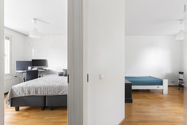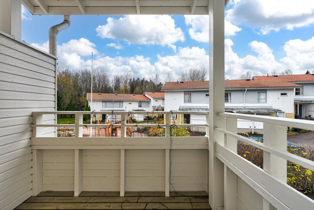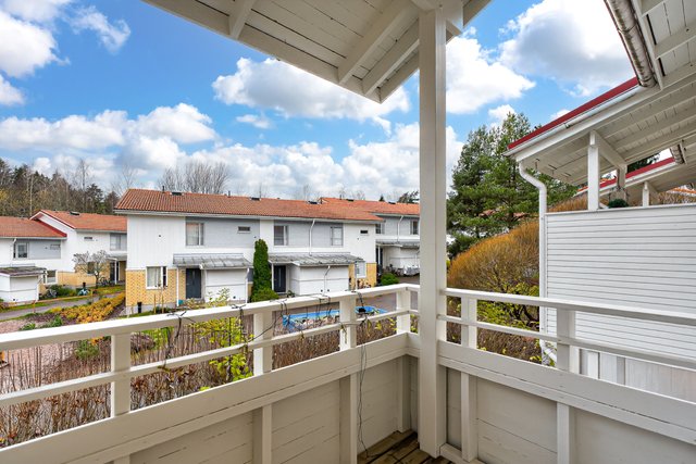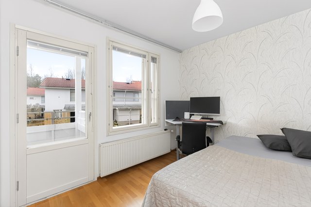 Yläkerrassa sijaitsevat kaksi tilavaa makuuhuonetta, joista toisesta pääsee suoraan parvekkeelle. Oma sauna tarjoaa rentouttavat löylyt, ja alakerran erillinen wc tuo arkeen sujuvuutta. Asunnossa on runsaasti säilytystilaa: eteisessä ja makuuhuoneissa on liukuovikomerot, ja ulkona on lisäksi oma kylmä varasto.