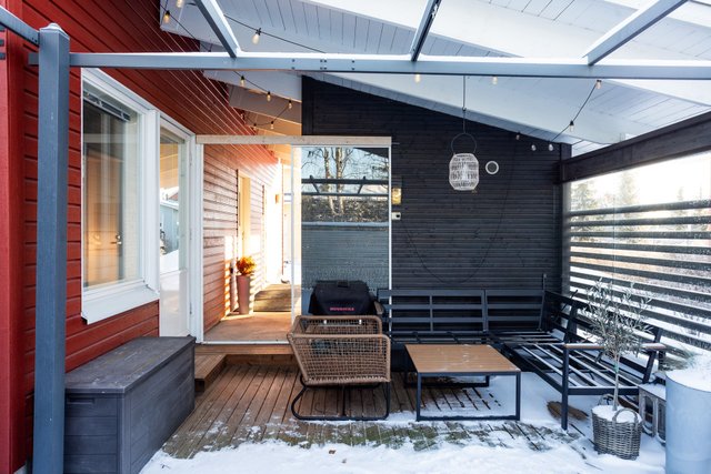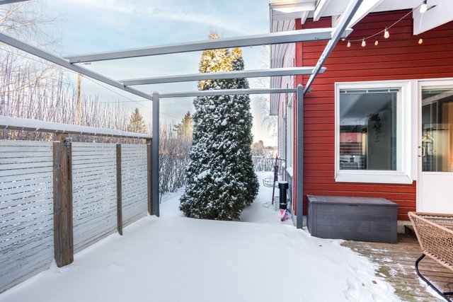 Hyvin pidetty siisti kokonaisuus, jossa olohuone ja keittiö muodostavat yhtenäisen ison tilan, josta käynti osittain katetulle ja aidatulle pihalle. Laadukkaat pintamateriaalit ja runsaasti säilytystilaa (vaatehuone, kaapistot, ja lämmin ulkovarasto). Autokatos ja pihapaikka aivan talon vieressä.