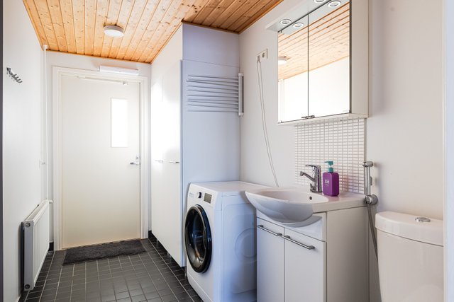 - Pesukoneliitäntä, lattialämmitys, pesuallas, lattiakaivo, ja tila pesutornille