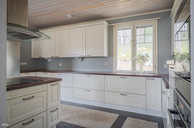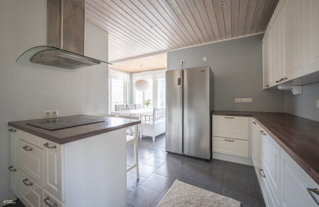 - Jääkaappipakastin, erillisuuni, mikroaaltouuni, astianpesukone, keittiösaareke, liesituuletin, ja liesi