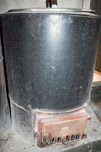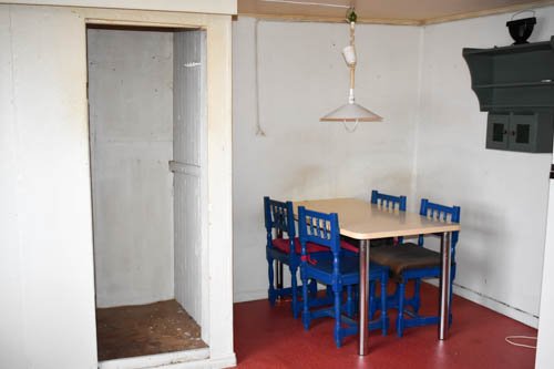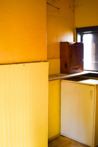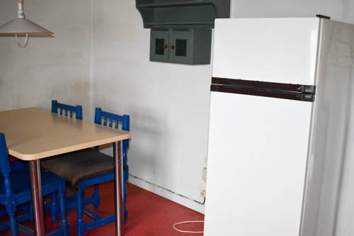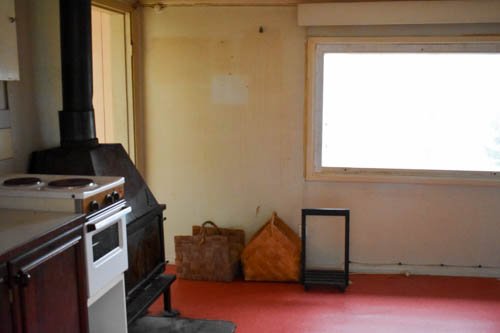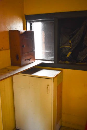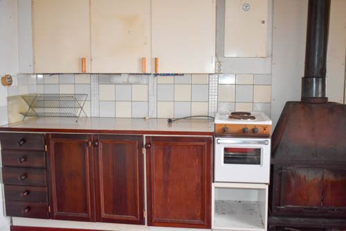 - Keittiö alkuperäisessä kuosissaan. Kodinkoneina sähköliesi ja jenkkikaappi, toimivuudesta ei ole varmuutta. Lisäksi peltitakka.