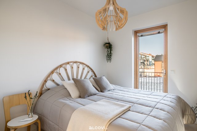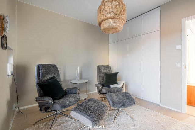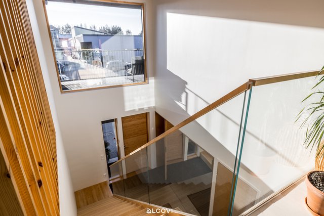 Yläkertaan johdattavat koivusta ja lasista valmistetut, aikaa ja käyttöä kestävät portaat. Kaikki kolme valoisaa, tilavaa makuuhuonetta on sijoiteltu fiksusti erilleen toisistaan, tarjoten rauhaa ja yksityisyyttä. Kahdessa makuuhuoneessa on omat parvekkeet. Kylpyhuone saunoineen hurmaa laadukkaalla viimeistelyllä sekä näyttävällä laatan ja puun yhdistelmällä – kokonaisuus on yksinkertaisesti upea.