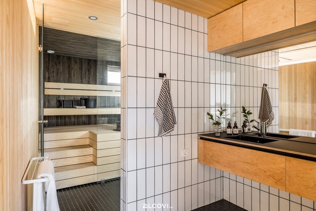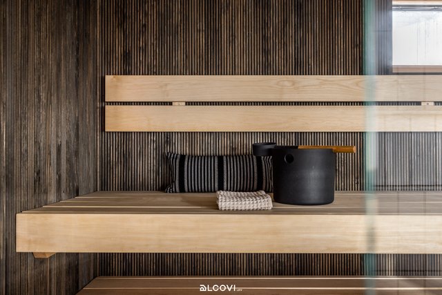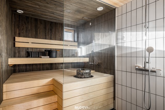 - Saunassa Harvia-kiuas etäohjauksella, lasiseinä, lauteet haapaa ja ikkuna. Seinät ja katto on saunasuojalla tummaksi käsiteltyä kuusisormipaneelia, lattia mustaa laattaa.