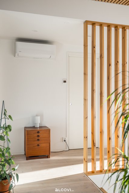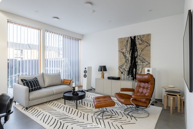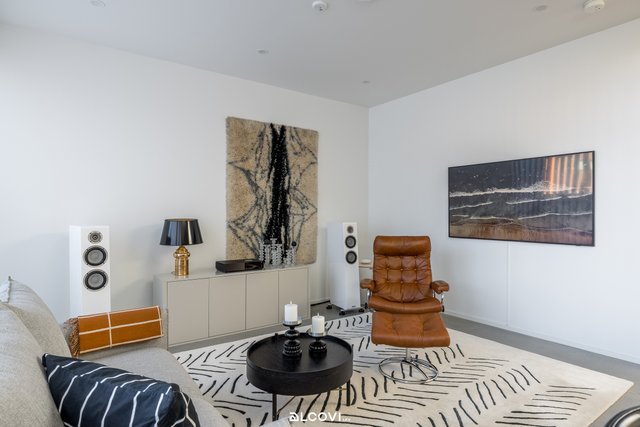 - Olohuoneen suurissa ikkunoissa pystylamellikaihtimet. Lattialämmitys (vesikiertoinen). Seinät ovat valkoisella maalatut, lattia silikaattikäsiteltyä teräsbetonia. Seinällä Samsung Frame-televisio.