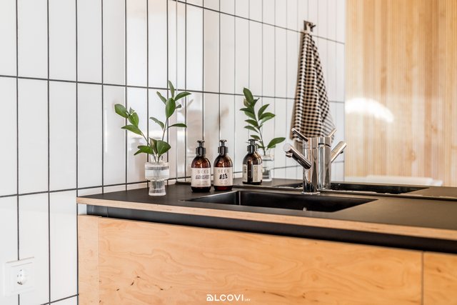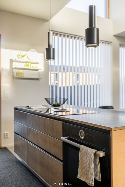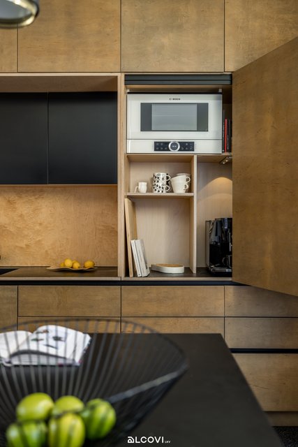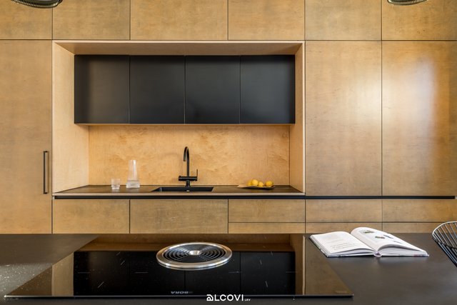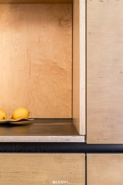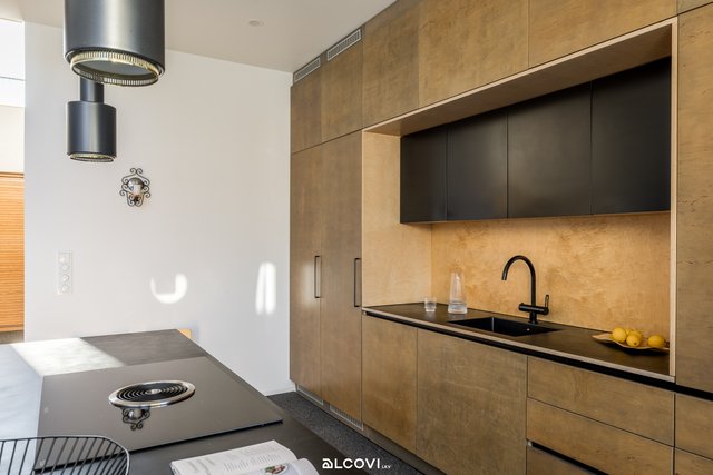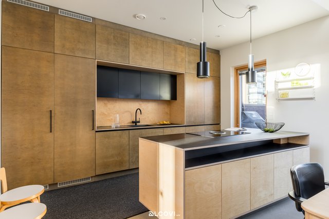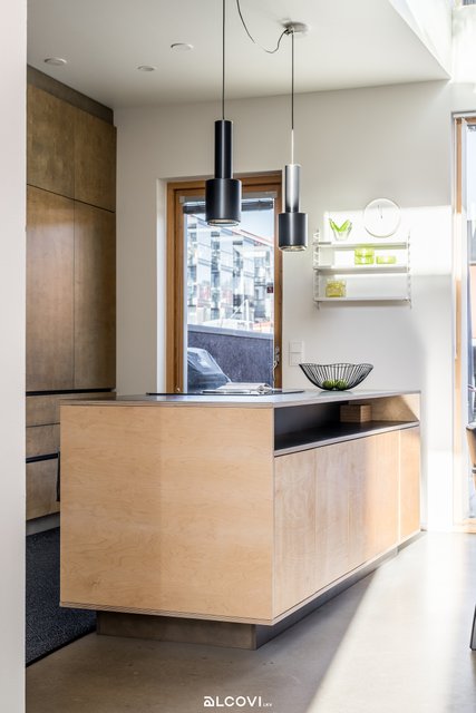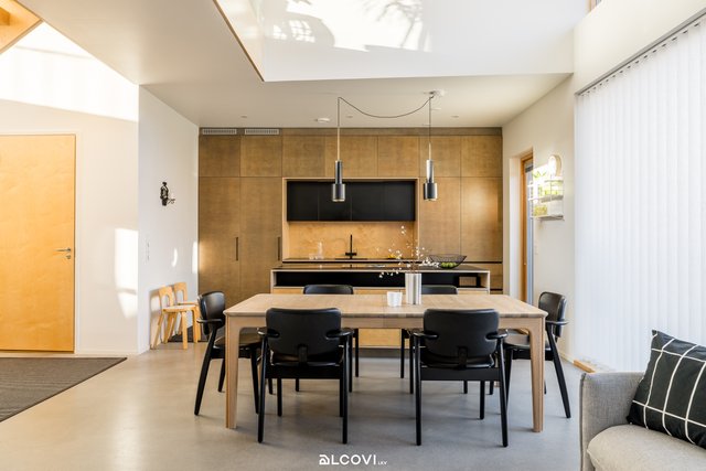 - Puusepän (Hollolan Puuosa Oy) toteuttaman avokeittiön varustukseen kuuluvat seuraavat integroidut Bosch-merkkiset kodinkoneet: jääkaappi, pakastin, astianpesukone, kalusteuuni ja mikroaaltouuni (aamiaiskaapissa), lisäksi saarekkeessa Bora-merkkinen induktioliesi, jossa upotettu liesituuletin. Laminoituun vaneritasoon upotettu allas, upotetut spottivalaisimet katossa. Keittiön kaappien rung ot ovat vaneria, ovet osin viilutettua rimalevyä, osin mustalla ympärimaalattua mdf-levyä. Lattialämmitys (vesikiertoinen). Seinät ovat valkoisella maalatut, lattia silikaattikäsiteltyä teräsbetonia. Avokeittiöstä on käynti takapihalle.