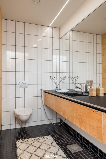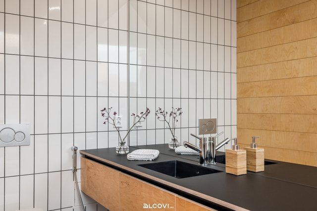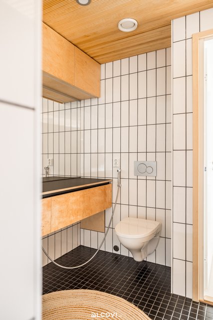 - Alakerrassa sijaitsevassa erillisessä wc:ssä on seinä-wc-istuin, peili, laminoituun vaneritasoon upotettu allas, allaskaappi (Hollolan Puuosa Oy), bidee-suihku, naulakko, upotetut spotti-valaisimet katossa ja lattialämmitys (vesikiertoinen). Seinät osin valkoista kaakelia (Arkitekt Wall white g lossy 10x30), osin koivuvaneria (Wicco), lattia mustaa laattaa.