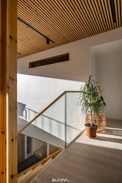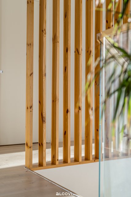 - Yläkerran käytävän puurima-seinä on valmistettu lakatusta männystä.