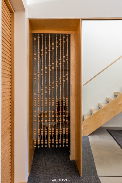 - Eteisessä korkea peililiukuovikaapisto (Hollolan Puuosa Oy). Eteisestä liukuovesta käynti arkieteiseen/varastoon. Eteisen seinät ovat valkoisella maalatut, lattia silikaattikäsiteltyä teräsbetonia. Lattialämmitys (vesikiertoinen). Yläkerran korkeassa, alhaalta ylös auki olevassa tilassa lakatusta männystä valmistettu rimakatto, jossa kiskoilla spottivalaisimia. Lattialämmitys (vesikiertoinen). Portaiden askelmat ovat lakattua koivua, runko koivuvaneria, kaide lasia ja lakattua koivua (Hollolan Puuosa Oy). Takapihan terassi ja parvekkeiden lattiat ovat lehtikuusta.
