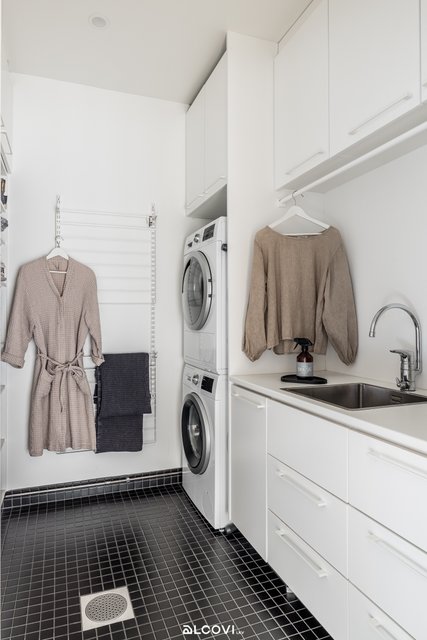 - Yläkerrassa sijaitsevassa kodinhoitohuoneessa on vesipiste, kiinteät kaapistot (Hollolan Puuosa Oy), Bosch-merkkiset pyykinpesukone + kuivausrumpu (liitännät olemassa), upotetut spottivalaisimet katossa ja lattialämmitys (vesikiertoinen). Seinät ovat valkoisella maalatut, lattia mustaa laattaa.