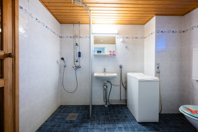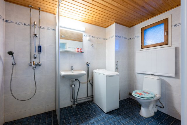 - WC-istuin, suihku, suihkuseinä, pesukoneliitäntä, lattialämmitys, pesuallas, peilikaappi, ja bidee-suihku