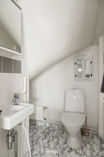 - Alakerran wc-tilan lattia muovimattoa, seinät maalattu, wc-istuin, allas, peilikaappi.