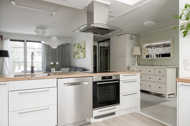 - 2019 uusitussa Epoq keittiössä runsaasti kaapisto- ja laatikostotilaa, työtasot massiivitammea, astianpesukone, jääkaappi ja pakastinkaappi, integroidut mikroaaltouuni, induktioliesi ja erillisuuni, lattia vinyylilankkua ja seinät tapetti / maalattu.