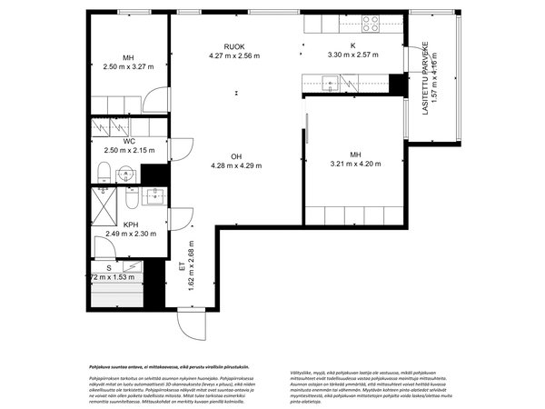 Yhtiöjärjestyksen mukaan 3h+k+s+khh/wc+parv