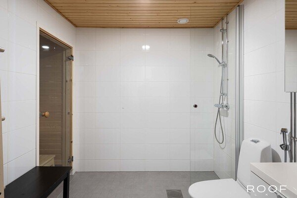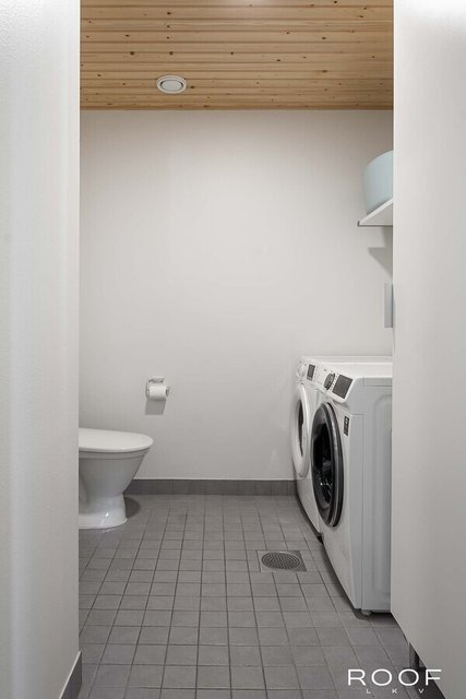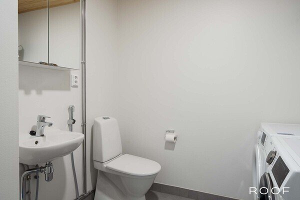 Erillinen wc toimii samalla kodinhoitohuoneena, johon mahtuvat sekä pyykinpesukone että kuivausrumpu. Tämä ratkaisu tekee arjesta sujuvampaa ja lisää asumismukavuutta entisestään.