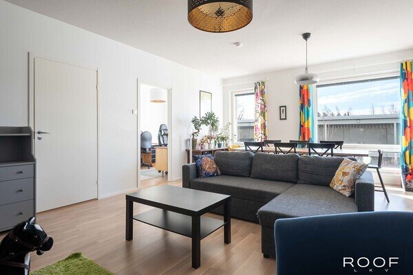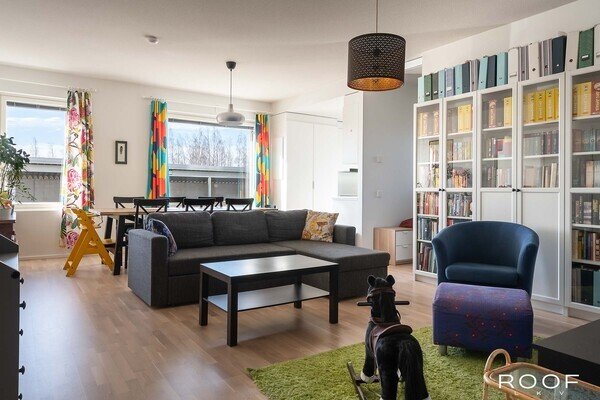 Valoisa ja toimiva kulmahuoneisto ensimmäisessä kerroksessa – oma sauna ja lasitettu parveke.