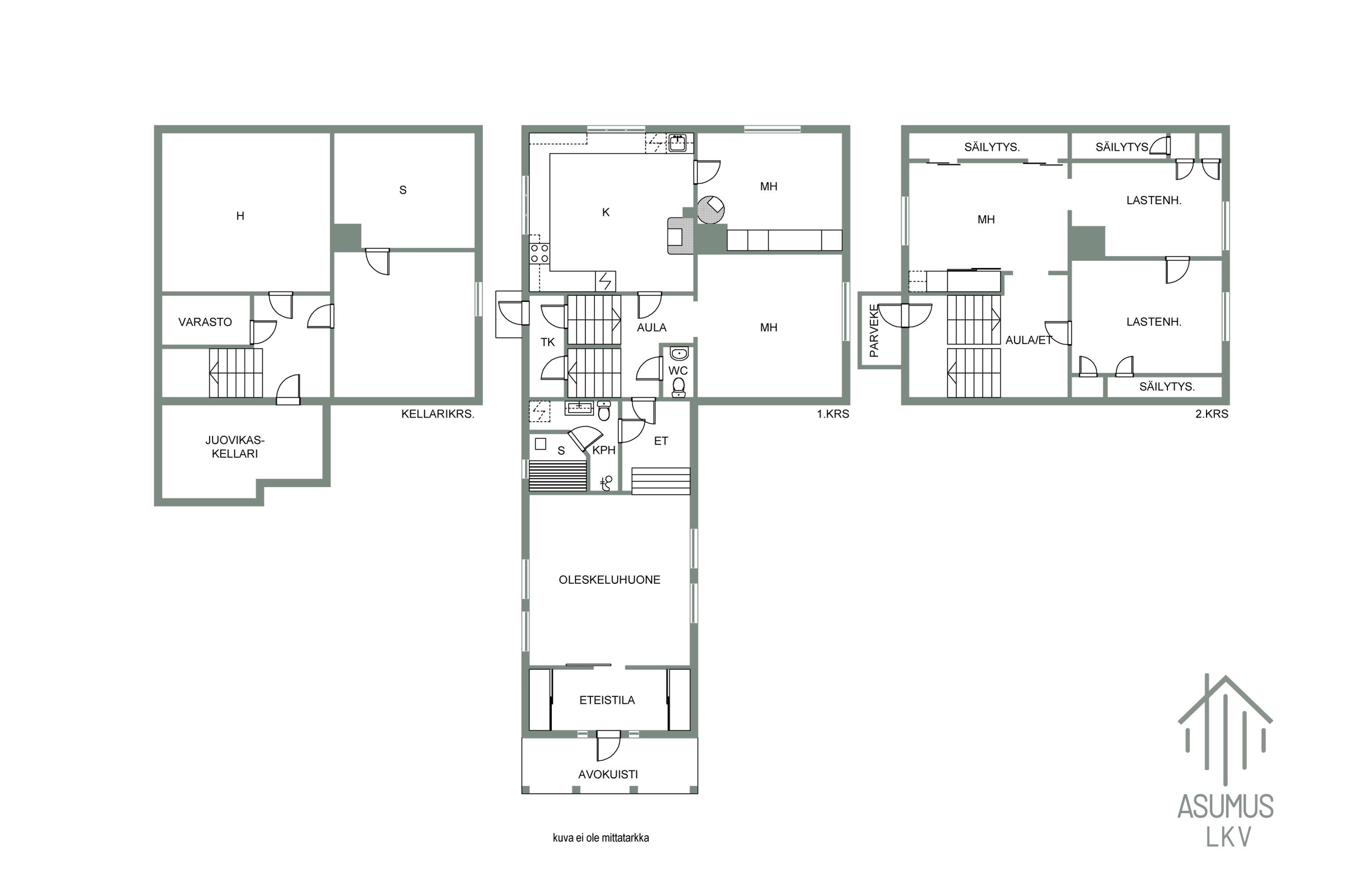 1.krs: 2h, k, oleskeluhuone, wc, kph, s 2.krs.: 3h, aula Kellari: huone, vanha sauna, varastotilat