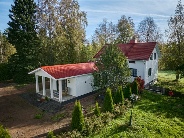 - Laajennusosan yhteydessä on iso, katettu, n. 10 m² terassi, jolta aukeaa näkymät omalle pihamaalle ja puutarhaan.