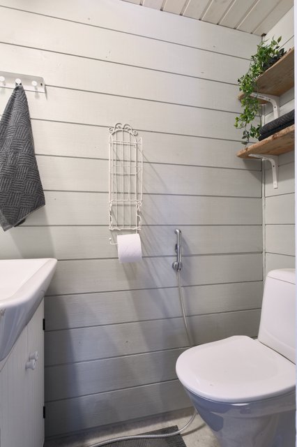 - WC-istuin, suihku, peilikaappi, pesuallas, allaskaappi, bidee-suihku, ja pesukoneliitäntä