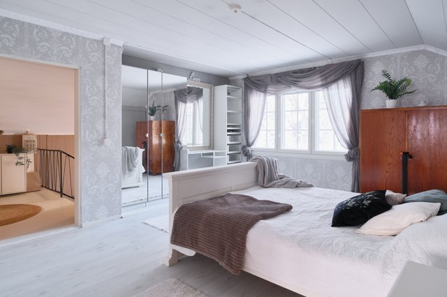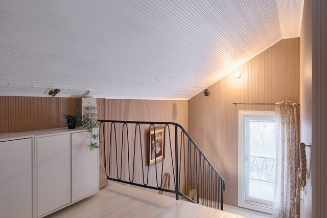 - Erillisiä makuuhuoneita löytyy peräti viisi, joista kolme sijaitsee yläkerrassa ja kaksi 1. kerroksessa. Keittiön viereisessä makuuhuoneessa on vanha pönttöuuni, joka vaatii kunnostusta.