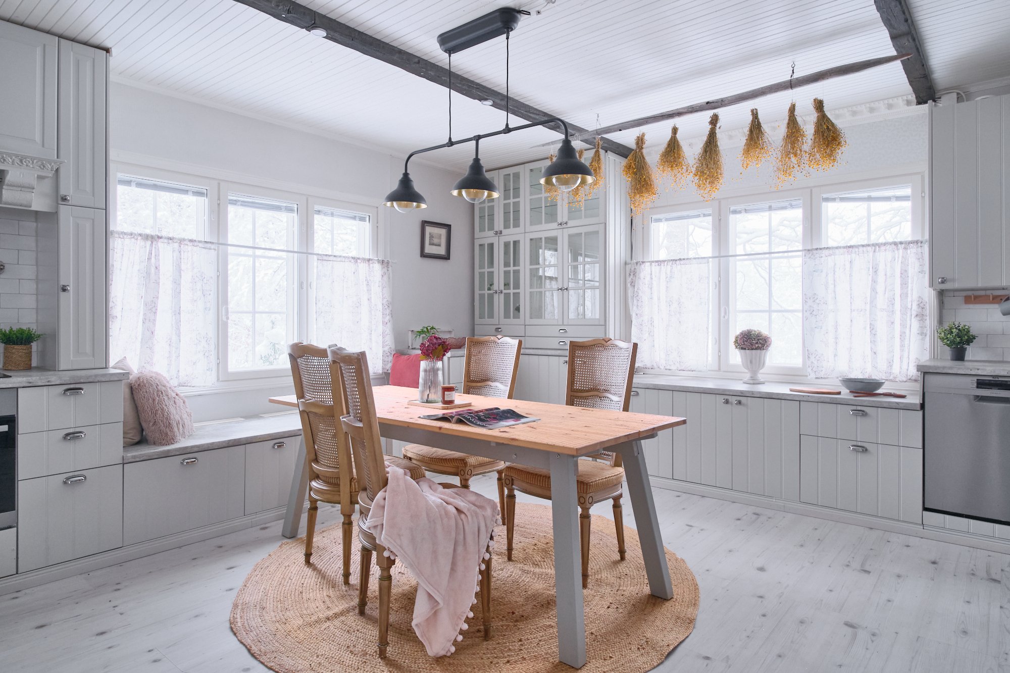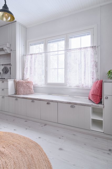 - Tilava, n. 30 m²:n, iso maalaisromanttinen keittiö, jossa varaava leivinuuni-takka tunnelmanluojana ja aina tarpeellisena lisälämmönlähteenä. Tähän tilaan mahtuu useampikin kokkaaja ja ruokailija saman aikaan. Säilytystilaa riittää runsaasti. Kauniit astiat ja lasiesineet saat esille lasivitriiniin ovien taakse. Ikkunan edessä on istuinpenkki, jonka alla lisäsäilytystilaa. Ikkunoista avautuu näkymä omaan puutarhaan.