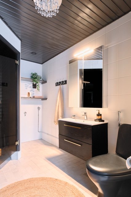 - Tilava kylpyhuone erillisellä suihkutilalla varustettuna toimii samalla myös tarvittaessa kodinhoitotilana. Modernisti mustaa ja valkoista, johon on yhdistetty kullansävyinen tehosteseinä. Kylpyhuoneen yhteydessä on sauna.