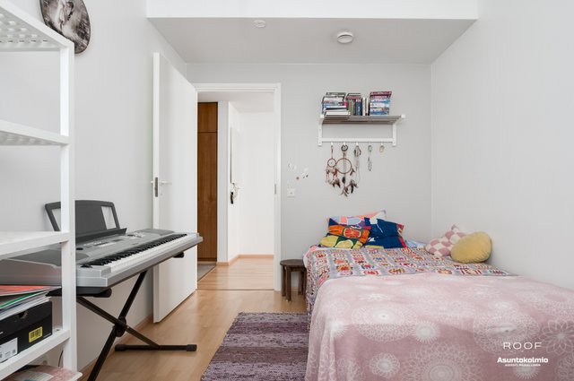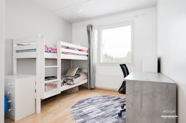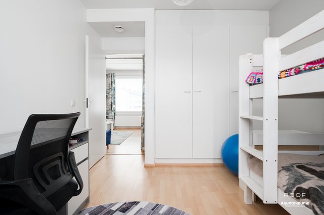 Itse asunto sijaitsee hissitalon ylimmässä kerroksessa ja kyseessä on rapun päätyhuoneisto ja kodin ikkunat ovat peräti kolmeen suuntaan! Kodissa on kaksi reilun kokoista makuuhuonetta runsaine säilytystiloineen. Säilytystilaa lisää entisestään huoneistokohtainen varasto joka on ensimmäisessä kerroksessa. Asumismukavuutta lisää lasitettu parveke ja oma sauna. Pinnat ovat pitkälti alkuperäisessä kunnossa mutta silti hyvin ja siististi pidetty.