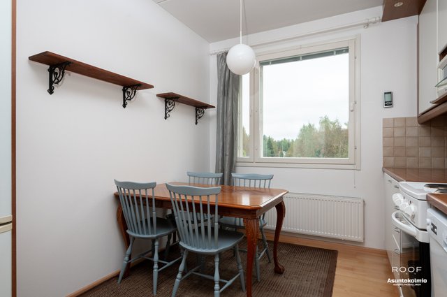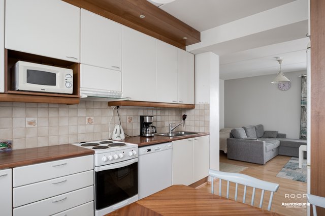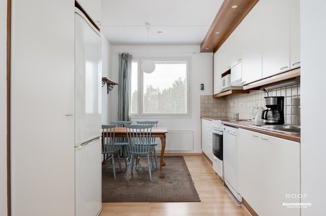 - Varustus: Jääkaappi/pakastin, sähköliesi, liesituuletin, astianpesukone. Työtasot laminaattia.