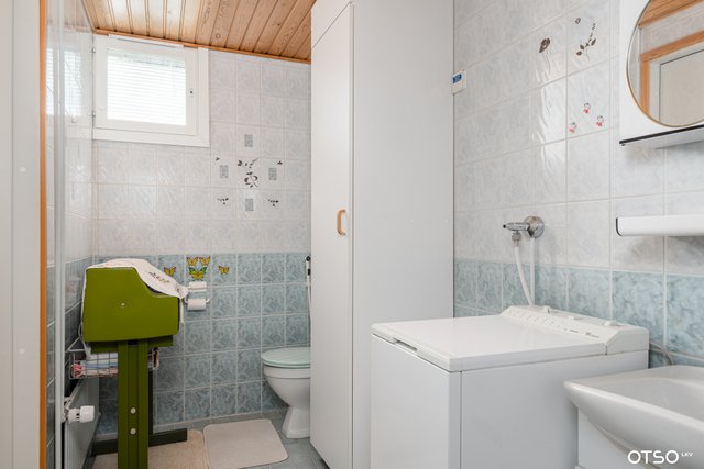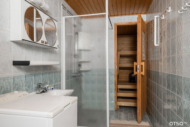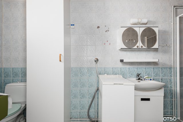 - WC-istuin, suihku, pesukoneliitäntä, bidee-suihku, pesuallas, peilikaappi, ja allaskaappi