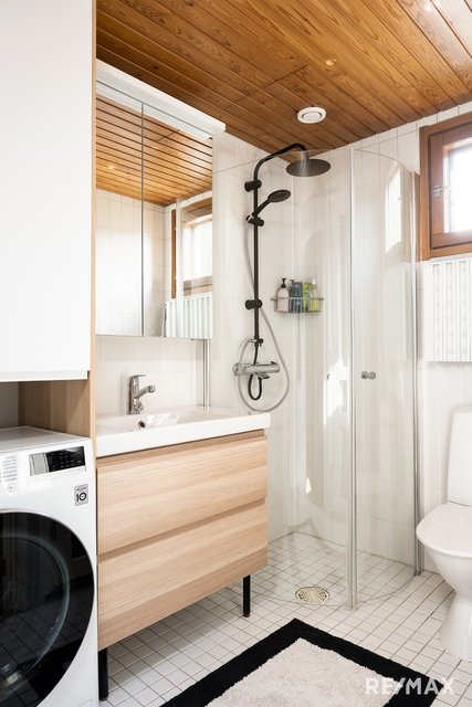 - WC-istuin, suihkuseinä, pesukoneliitäntä, peilikaappi, pesuallas, allaskaappi, ja bidee-suihku