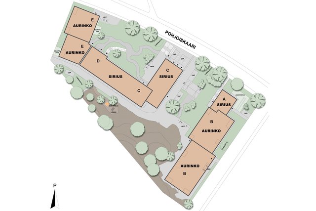 - Auringon yhtiö koostuu B- ja E-taloista. Kerroksia B-talossa on 4-5 ja E-talossa on 3-4 kerrosta. Lisäksi kummassakin rapussa on kellari. Asunto Oy Helsingin Lauttasaaren Aurinko käsittää uudet rakennukset tontilla ja niihin liittyvät autohallit. Hallinnanjakosopimuksen mukaisesti yhtiöiden yksinomaisessa hallinnassa olevat tilat: - Auringon omistamassa E-rakennuksessa sijaitseva ulkoiluvälinevarasto on Asunto Oy Helsingin Lauttasaaren Siriuksen yksinomaisessa hallinnassa. - Siriuksen omistamassa CD-rakennuksessa sijaitseva ulkoiluvälinevarasto on Asunto Oy Helsingin Lauttasaaren Auringon yksinomaisessa hallinnassa. Hallinnanjakosopimuksen mukaisesti yhtiöiden yhteisessä hallinnassa ja/tai käytössä olevat tilat: - Pihakansi tavanomaisine penkkeineen ja kulkureitteineen - Kiinteistöä palveleva pysäköintilaitos, joka sijaitsee Auringon omistaman rakennuksen yhteydessä - Kiinteistöä palveleva jätehuone sijaitsee Siriuksen omistaman rakennuksen kellarin yhteydessä - Kiinteistöä palvelevat: kerhotila aputiloineen, talosaunaosasto, talopesula ja kuivaushuone sijaitsevat Siriuksen omistaman rakennuksen 1. kerroksessa. Yhteiskäyttöinen S1-luokan väestönsuoja sijaitsee talossa B, toimien normaaliaikaan irtaimistovarastona.