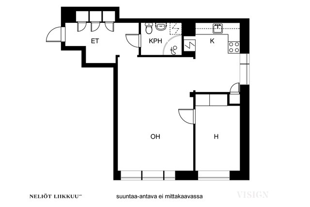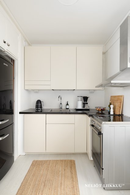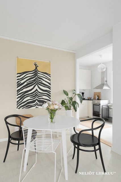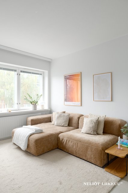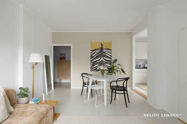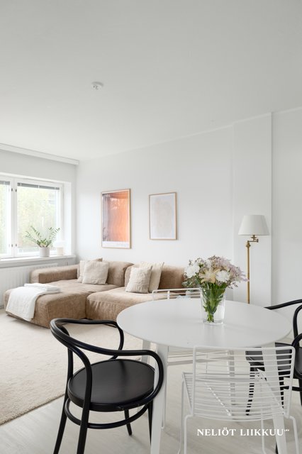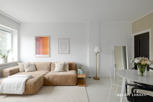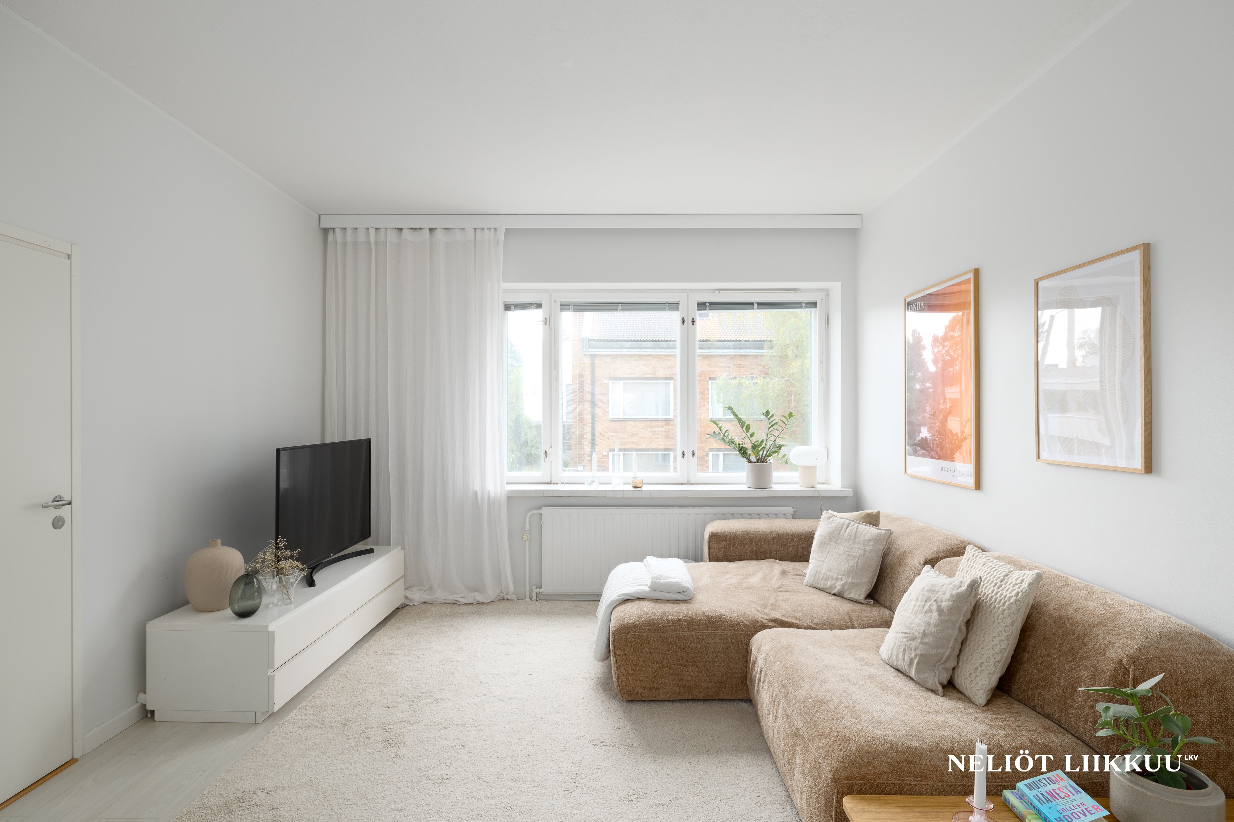 Kodin hyvä fiilis alkaa avarasta olohuoneesta, jossa on hyvin tilaa sohvalle sekä ruokailuryhmälle. Olohuoneesta on käynti makuuhuoneeseen sekä erilliseen keittiöön. Keittiöön on saatu kaikki tarvittava hyvin mahtumaan mm. modernit kodinkoneet sekä sopivasti kaappi- ja laskutilaa.