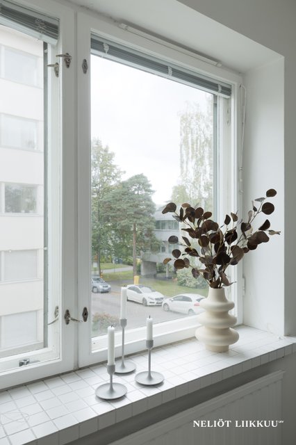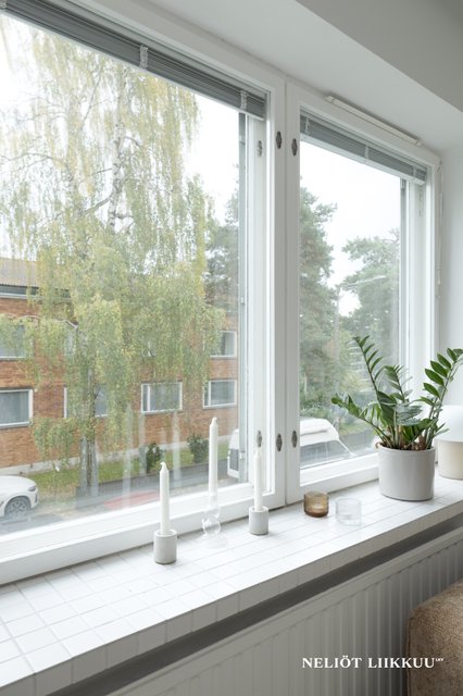 Pohjaratkaisunsa ansiosta asunto sopii niin yksin elävälle kuin pariskunnalle. Ikkunapinta-alaa asunnossa on runsaasti, joten luonnonvaloa riittää. Kodista avautuu näkymät kahteen eri ilmansuuntaan, ja merikin pilkottaa puiden välistä.