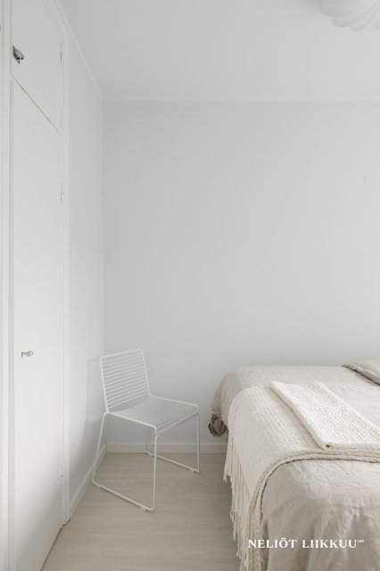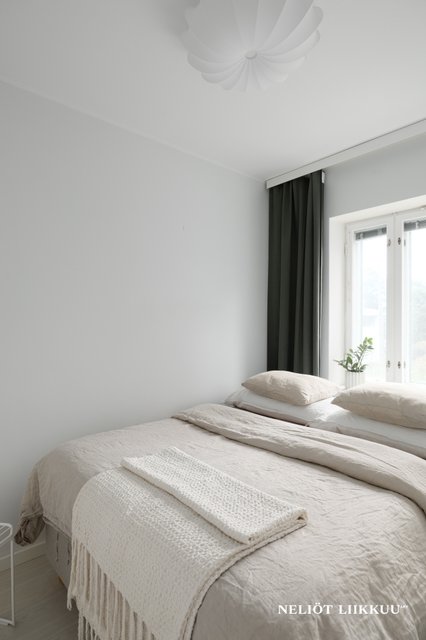 Kodikas tunnelma jatkuu kompaktiin makuuhuoneeseen, jonne mahtuu parisänky ja kiinteät kaapistot. Putkiremontin yhteydessä vuonna 2017 remontoidusta kylpyhuoneesta löytyy myös kaikki tarvittava, mm. paikka pyykinpesukoneelle ja lattialämmitys. Säilytystilaa löytyy makuuhuoneen ja eteisen kaapistoista sekä huoneistokohtaisesta varastokomerosta.