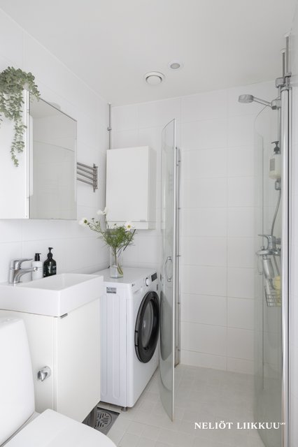 - WC-istuin, suihku, suihkuseinä, lattialämmitys, pesukoneliitäntä, peilikaappi, pesuallas, allaskaappi, ja bidee-suihku