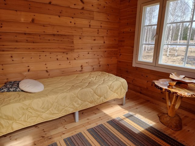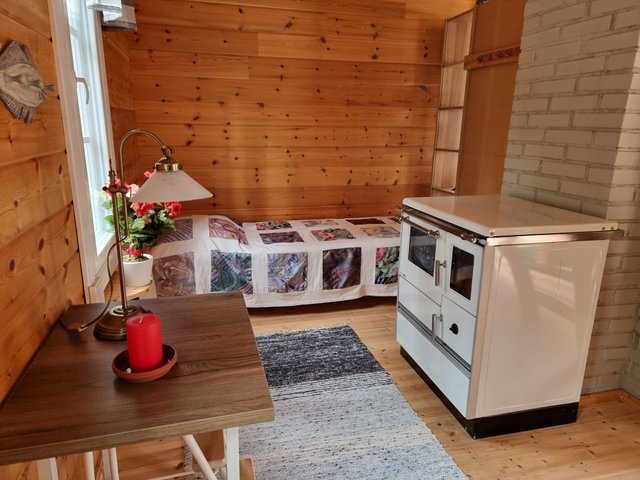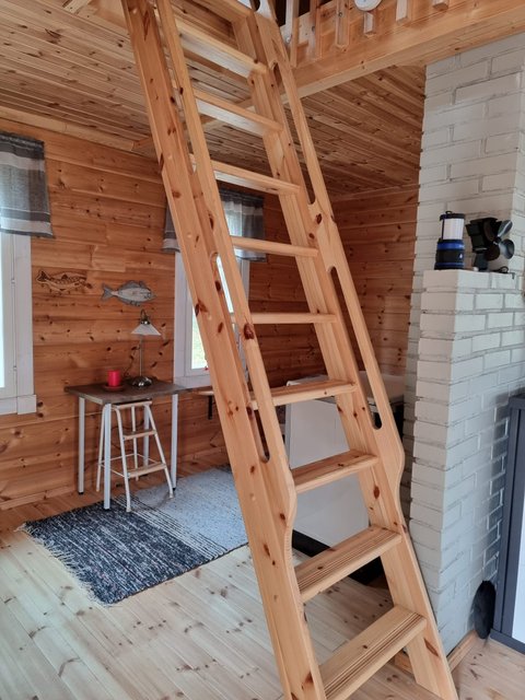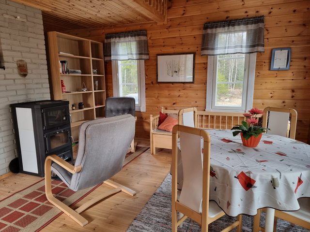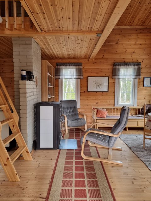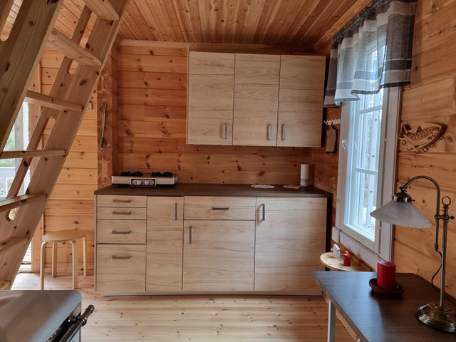 Mökin tilat ovat kompaktit mutta toimivat. Alakerran tupa on kodikas ja valoisa, takka luo lämpöä ja tunnelmaa. Yläkerran parvi tarjoaa lisätilaa majoittumiseen. Keittiössä on sekä kaasuliesi että puuhella, mikä tekee ruoanlaitosta vaivatonta ja ekologista.
