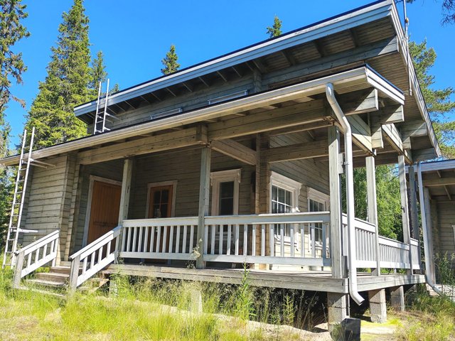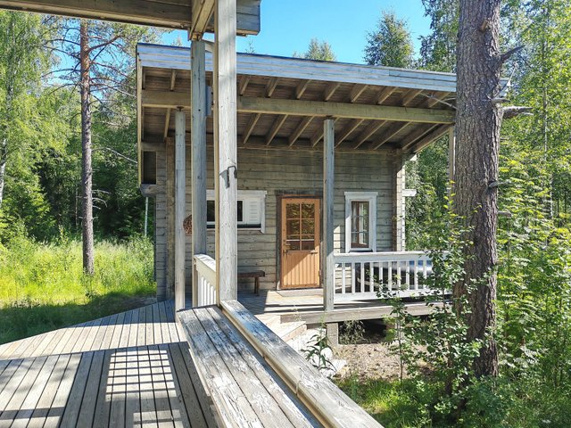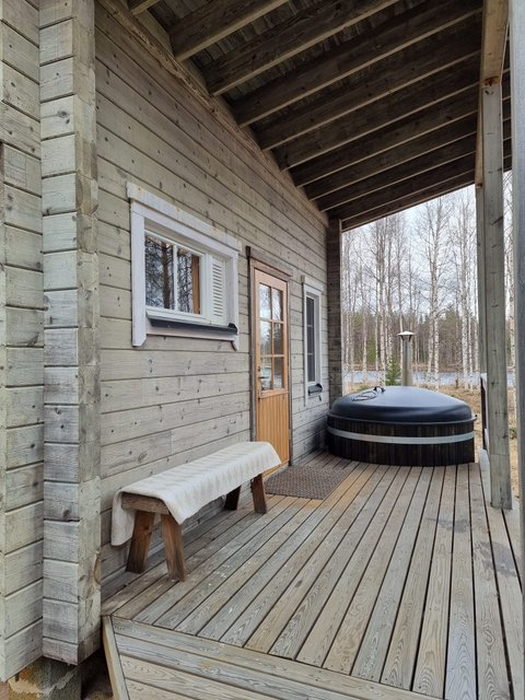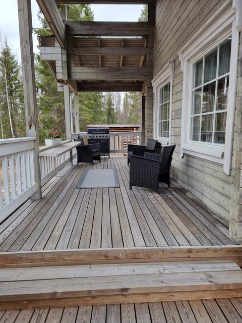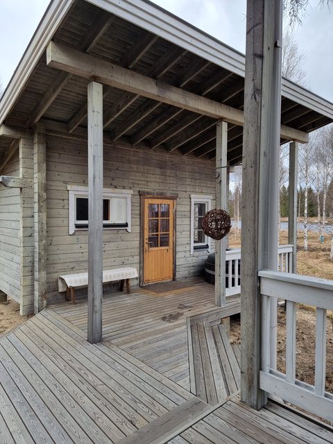 - Iso katettu terassialue yhdistää mökin ja saunan.