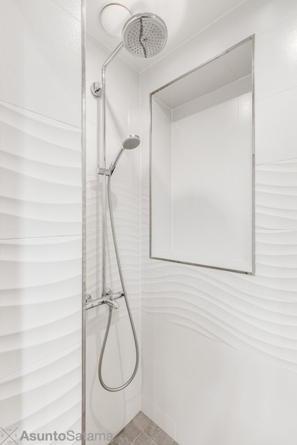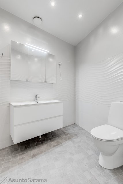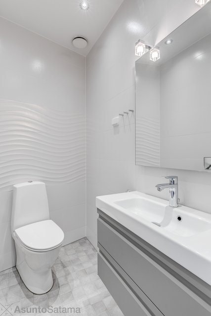 - WC-istuin, suihku, pesukoneliitäntä, peilikaappi, pesuallas, allaskaappi, ja bidee-suihku