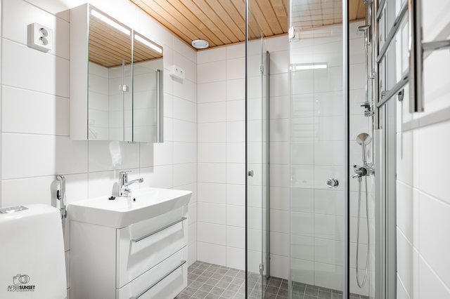 - WC-istuin, suihku, pesukoneliitäntä, peilikaappi, pesuallas, ja bidee-suihku