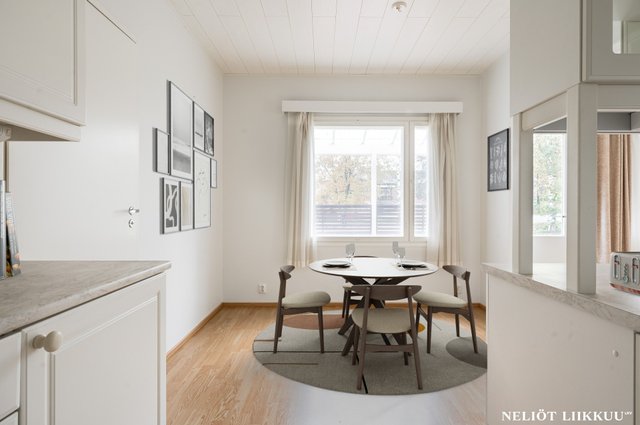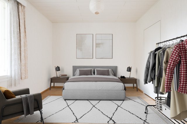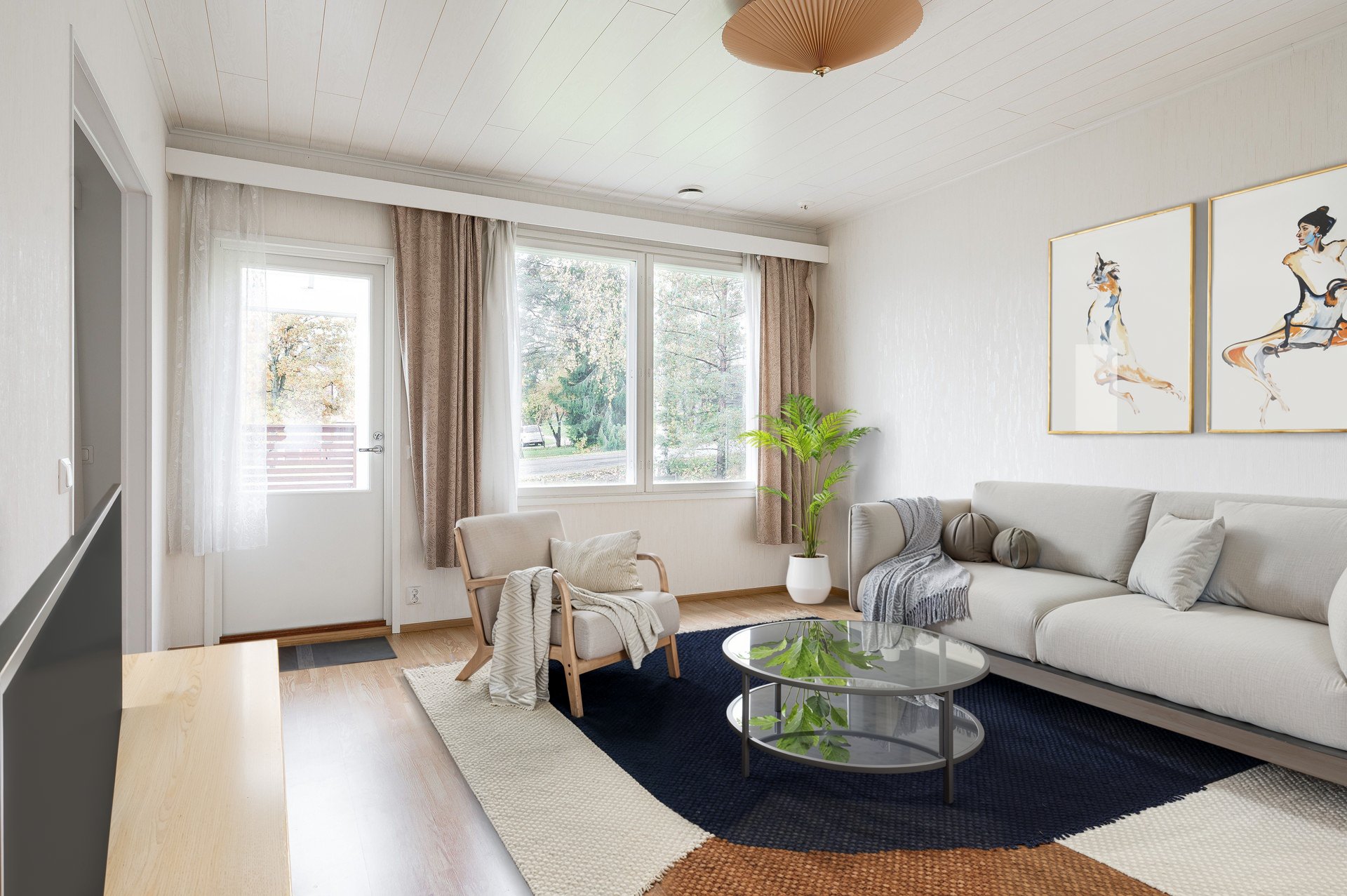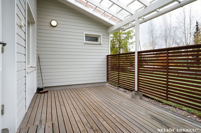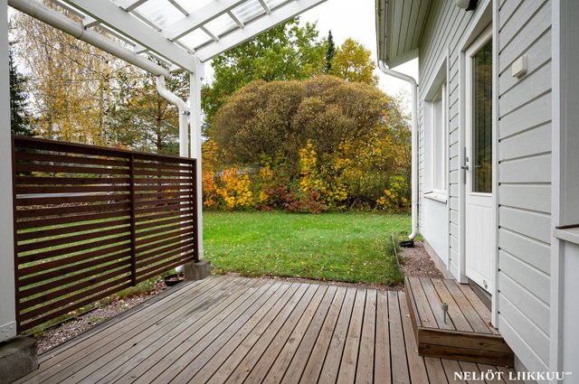 Kodin sydän on avara olohuone, josta on käynti terassille, jossa voi nauttia rauhallisista aamukahveista tai illanvietoista ystävien kanssa. Keittiössä on modernit varusteet, kuten saareke ja jääkaappipakastin, jotka tekevät ruoanlaitosta sujuvaa. Kaksi makuuhuonetta tarjoavat rauhallisen tilan levolle, ja säilytystilaa löytyy runsaasti vaatehuoneesta ja ulkovarastosta.