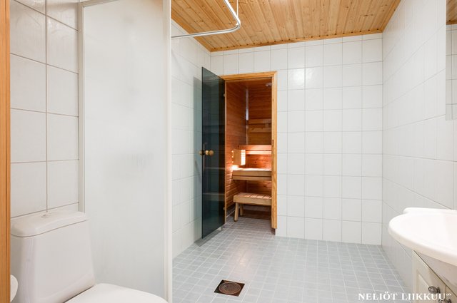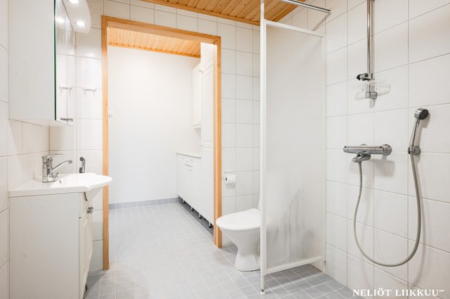 - WC-istuin, suihku, suihkuseinä, lattialämmitys, peilikaappi, allaskaappi, pesuallas, ja bidee-suihku