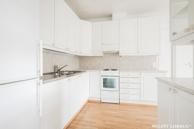 - Jääkaappipakastin, uuni, liesi, liesituuletin, ja keittiösaareke