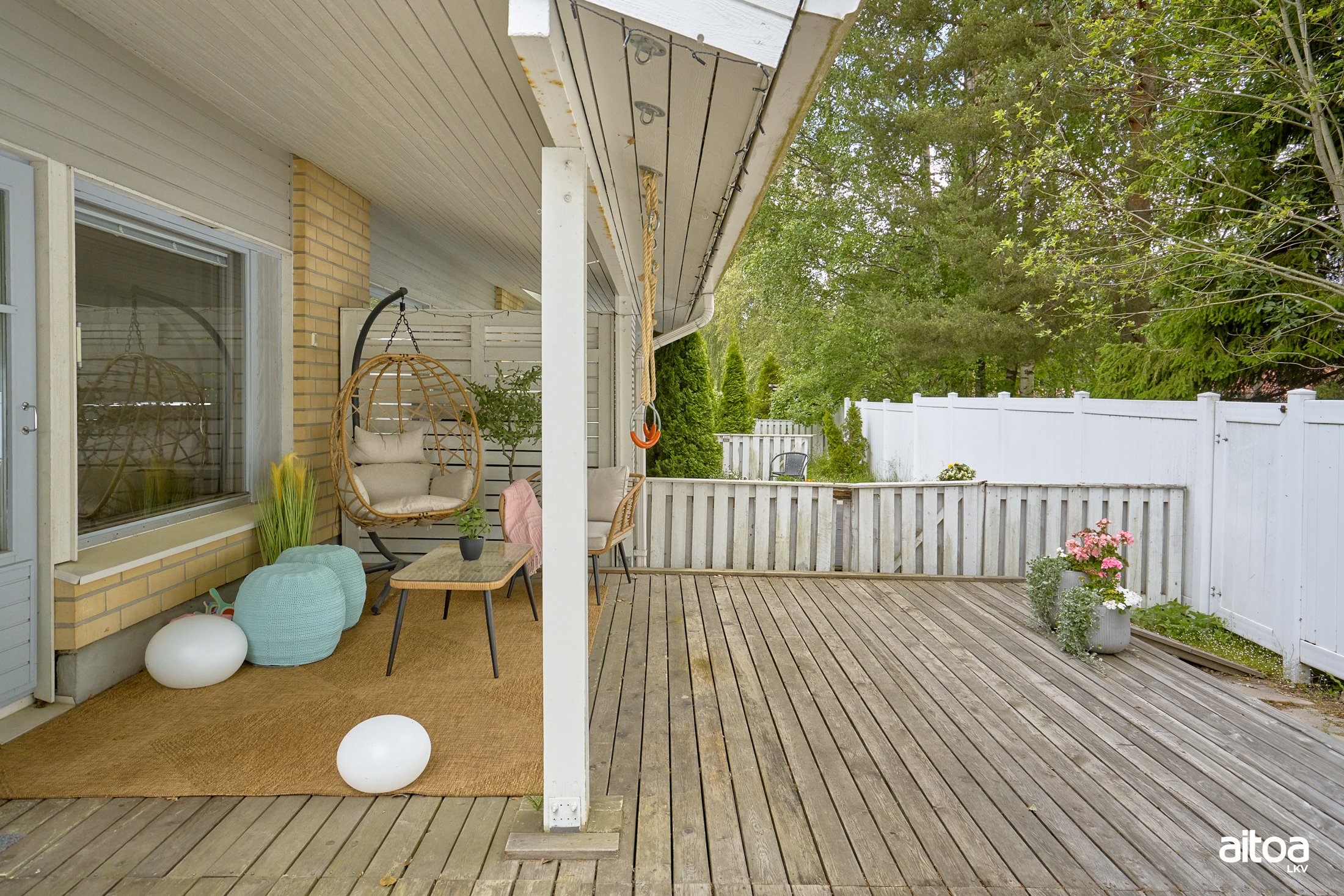 - Iso, katettu terassi noin pohjoisen suuntaan. Piha-aidassa portti.