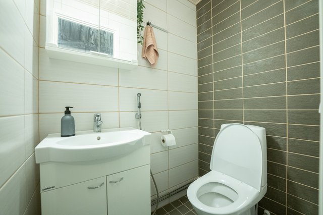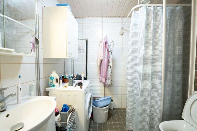 - WC-istuin, suihku, pesukoneliitäntä, peilikaappi, pesuallas, allaskaappi, ja bidee-suihku