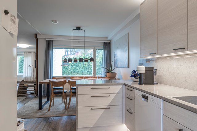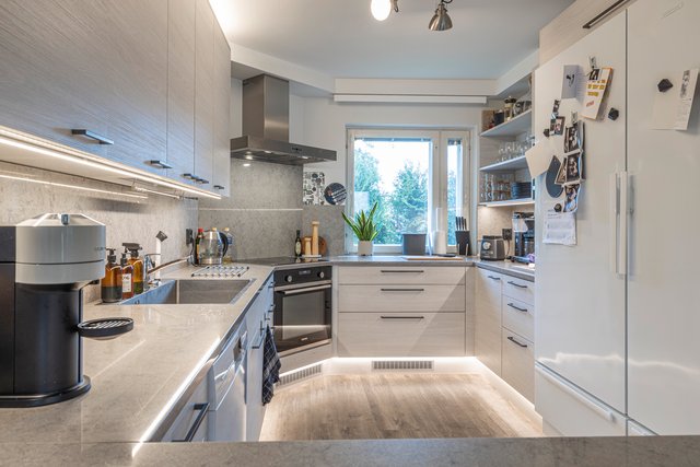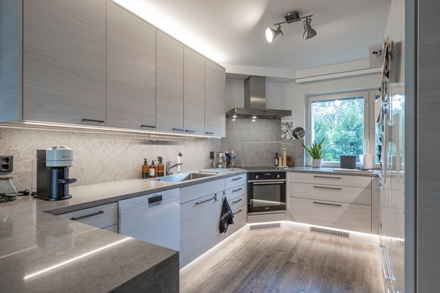 - Mittojen mukaan teetetty keittiö, jossa tyylikkäät vaaleat kaapistot sekä kvartsitasot.